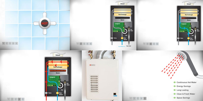 Step 3 : Now that the internal computer has been triggered, it immediately calculates how the burners need to be, in order to heat the water to the perfect temperature. This can be done with a gas burner or an electrical element. Either way, it provides a constant flow of hot water, without having to wait for a tank to fill back up.