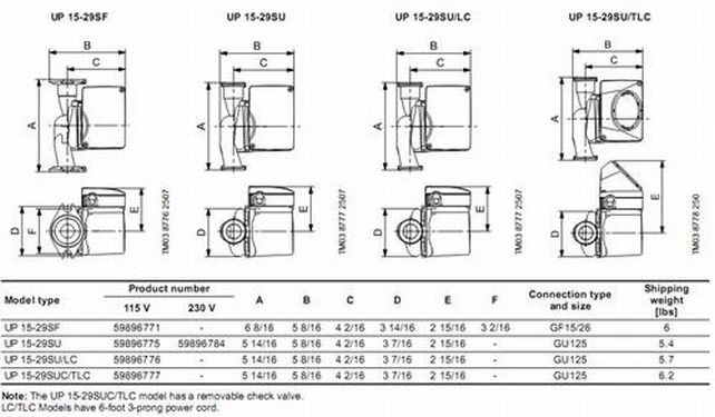 Specifications:Flow range: 0-20.5 U.S. gpmHead range: 0-9.7 feetMotors: 2-pole, single-phaseMax. liquid temperature: 230 °F (110 °C) and 150 °F for UP 15-29SU/TLCMin. liquid temperature: 36 °F (2 °C)Max. system pressure: 145 psiOpen systemNote: If the UP pump is equipped with a timer, the maximum liquid temperature is 150 °F (66 °C).Flange Model Pictured